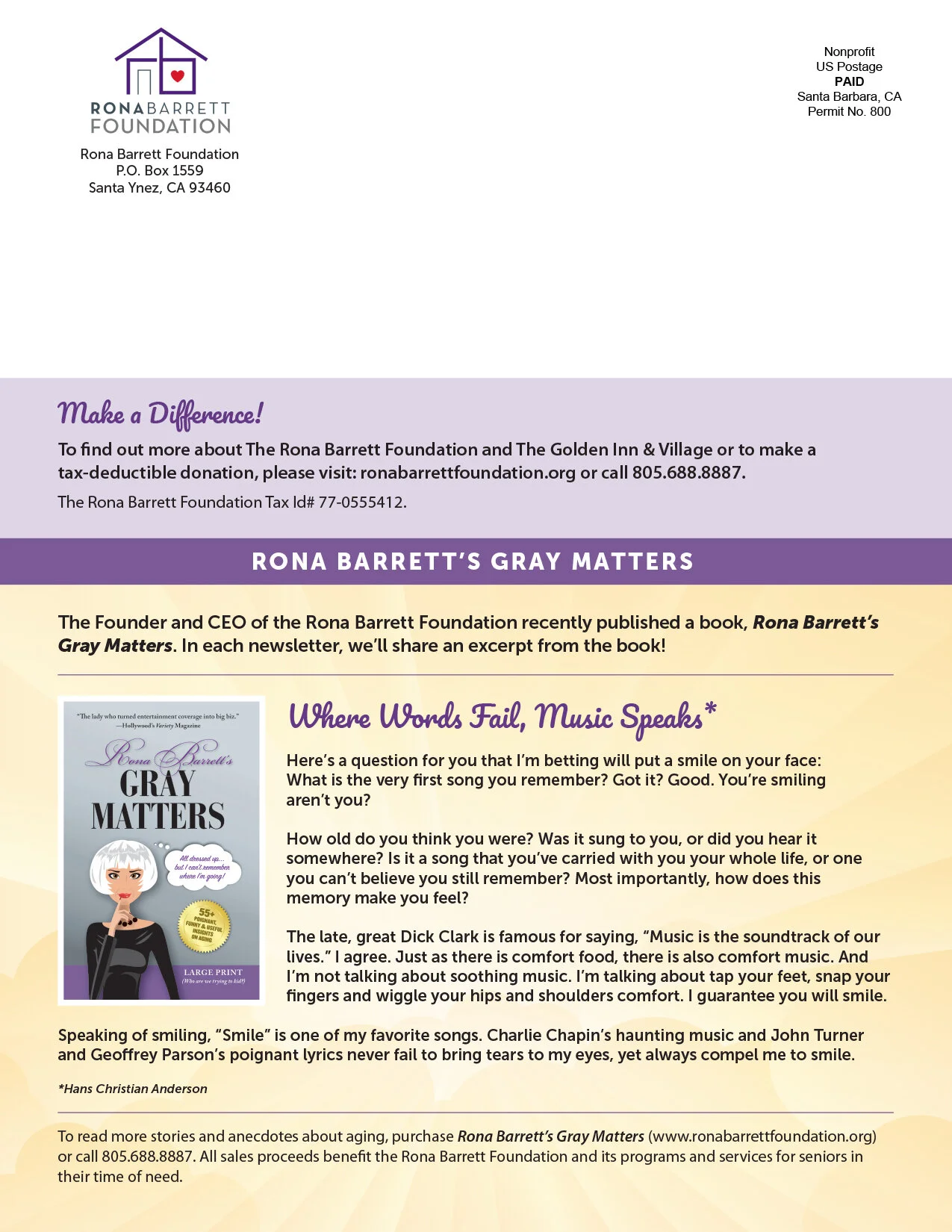 April 30, 2019 Rona Barrett Golden Gram Spring / Summer 2019 Quarterly Newsletter April 30, 2019 Rona Barrett Golden Gram Rona Barrett
